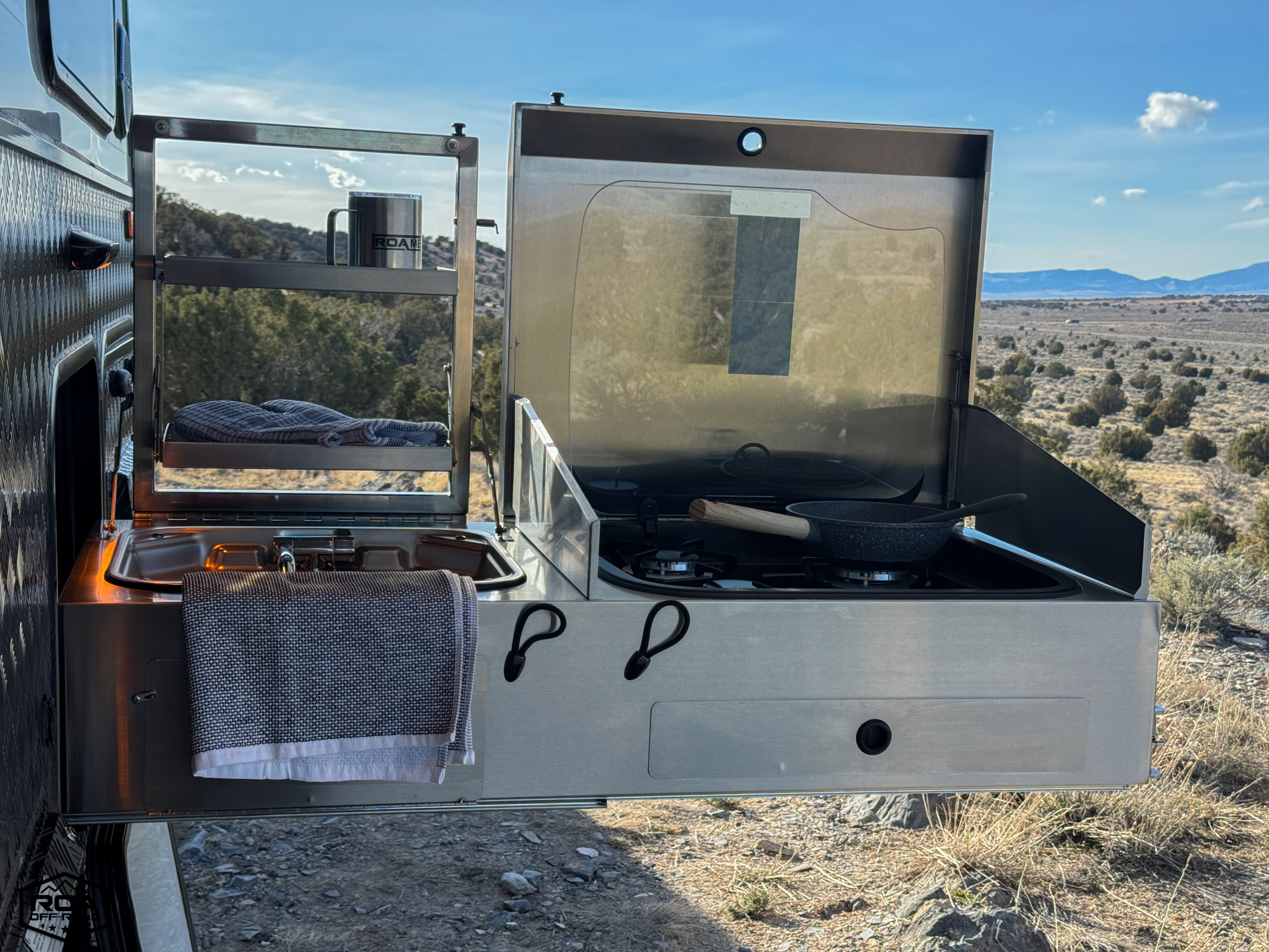 Teardrops typically have a rear galley — a compact slide-out kitchen with a small sink, a propane stove, and a fridge tucked nearby. The XT9 has an outdoor kitchen too, built into a larger rear box. Same concept, same purpose: cook your meals at camp without hauling a separate setup.