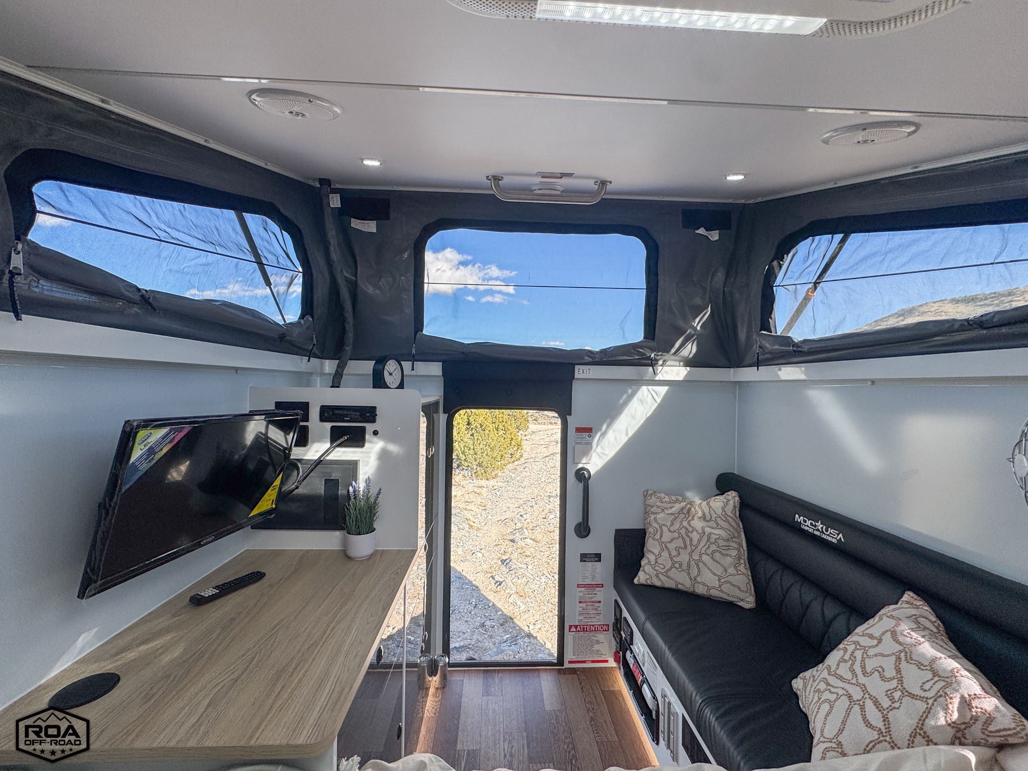 Then there’s the booth — a two-person seating area with a swivel table. Eat a meal. Read a book. Get some work done on a laptop. When you don’t need it, the table tucks away and you have open floor space. You simply don’t find this in a teardrop.