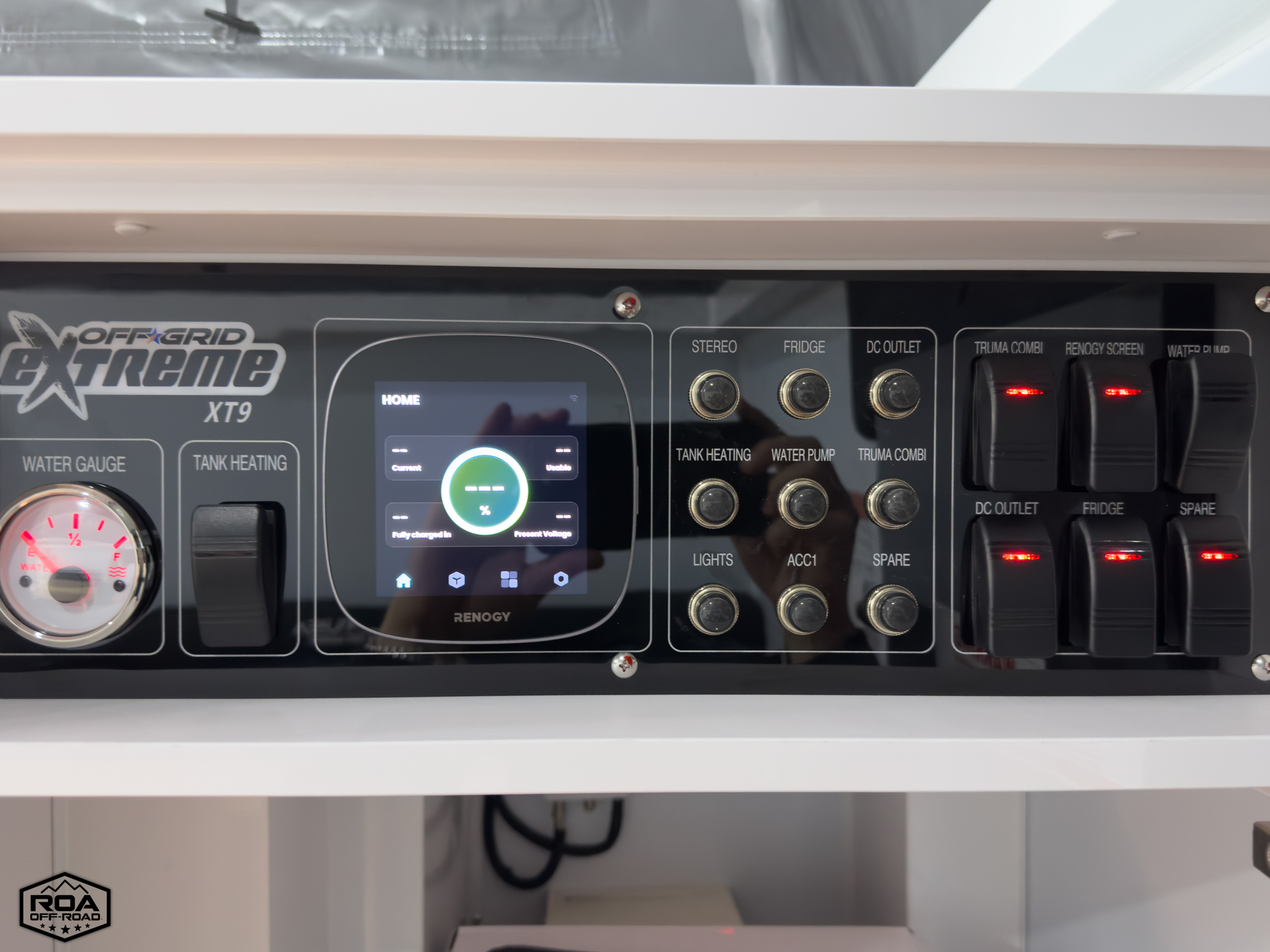 The Renogy system connects to your phone so you can monitor power from your tow vehicle. And ROA installs a DC-to-DC charger with an Anderson connection so your truck sends up to 30 amps back to the trailer battery while you drive. You never arrive at camp with a dead battery.