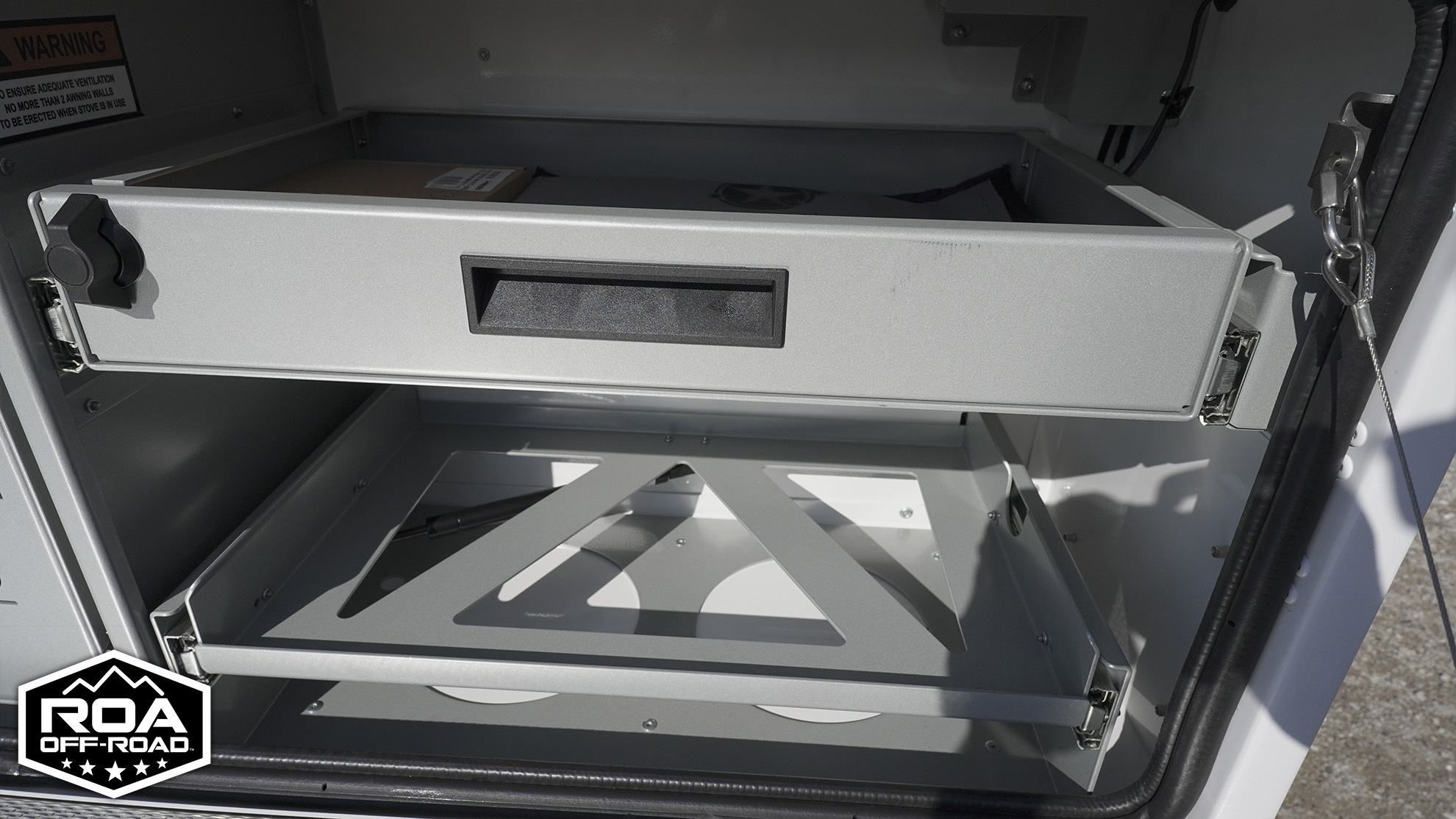 Galley kitchen with stove and storage; front-box utility shelf (Lifestyle Pack)