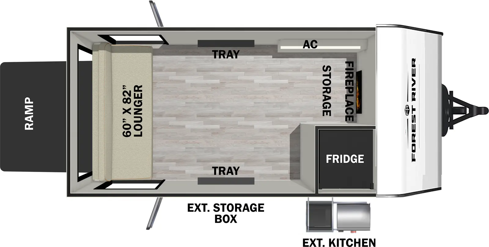 Compact toy hauler design with rear ramp door for bikes, ATVs, or gear.