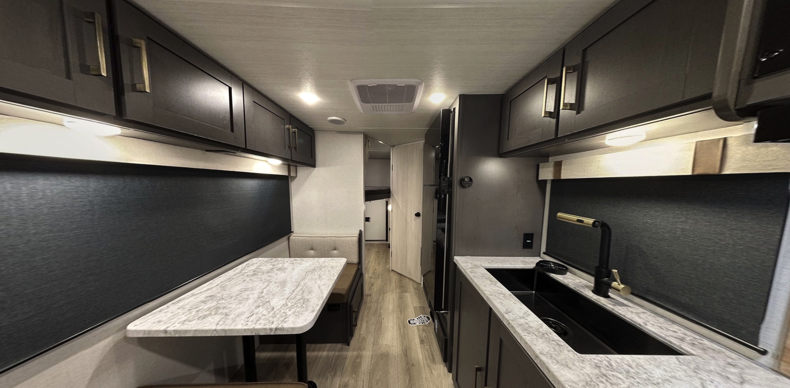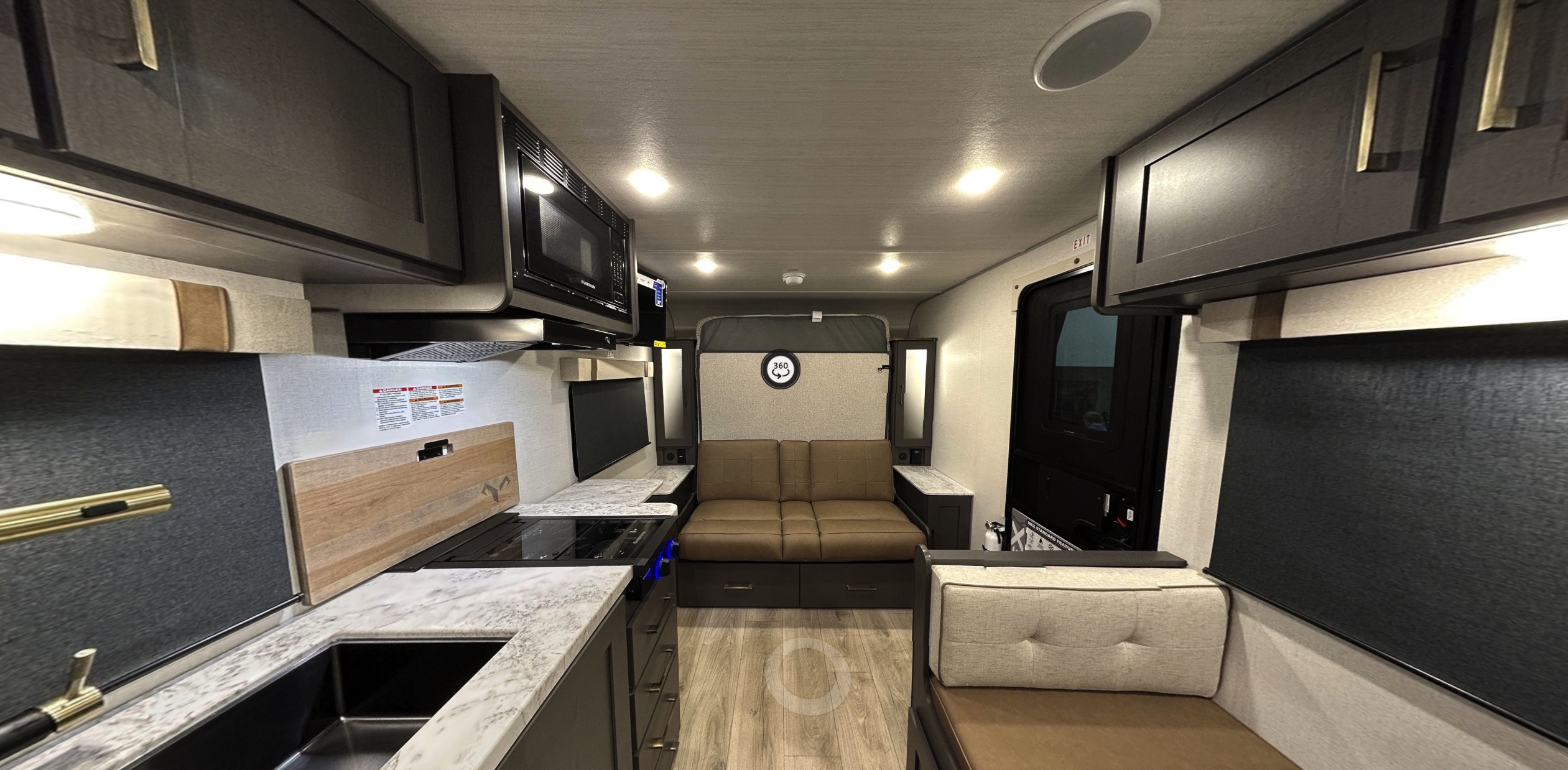Inside, the 19MBH makes the most of its space with a Murphy-style residential queen bed that folds up to reveal a sofa, creating extra seating during the day. A booth dinette offers additional seating for meals or game nights. The rear features full-size 44" x 74" bunks, with the bottom bunk folding up for large-item storage accessible from outside. The galley includes a large refrigerator, all-in-one air-fryer microwave, and large sink with cup washer. Comfort features include USB-C ports inside/out, motion lighting, a central vacuum, premium window treatments, and a 12V TV. The upgraded shower enclosure and 4-speed high-power bath fan in the rear bath make cleanup easy, while the 15,000 BTU A/C and on-demand tankless water heater keep conditions comfortable. The BEAST MODE power system expands the standard 200W solar / 30A controller with inverter prep to 400W solar with a 2000W inverter for real off-grid capability.
