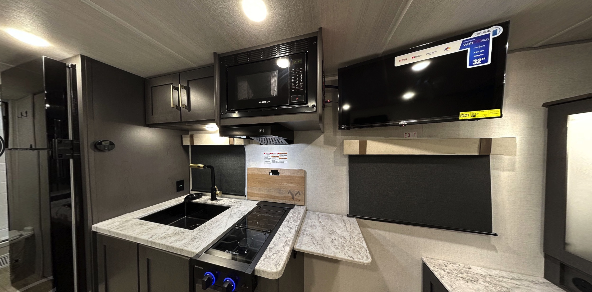 Galley with large refrigerator, air-fryer microwave, and large sink with cup washer