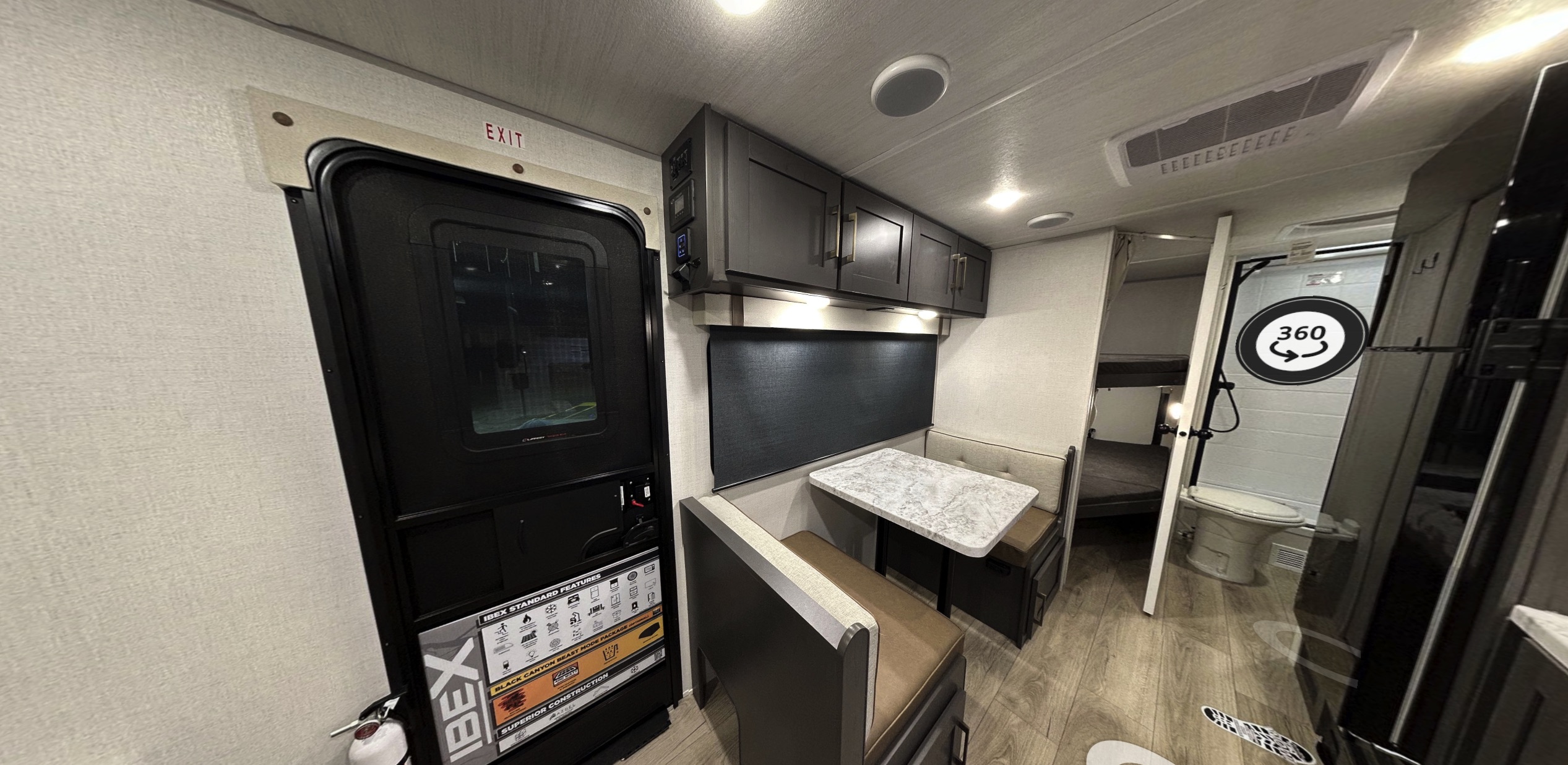The Ibex 19MBH BEAST MODE is a family-friendly, no-slide travel trailer designed to sleep up to five without sacrificing towing ease or everyday usability. At 24' 8" in length and 4,914 lb UVW, it blends space and efficiency, offering a front residential 60" x 80" queen Murphy bed, full-size double bunks, and a rear full bath. The BEAST MODE package adds off-grid confidence with independent suspension, a 400W solar package with 2000W inverter, a fresh-water filter, and a Maxxair roof vent cover, perfect for longer stays away from hookups.