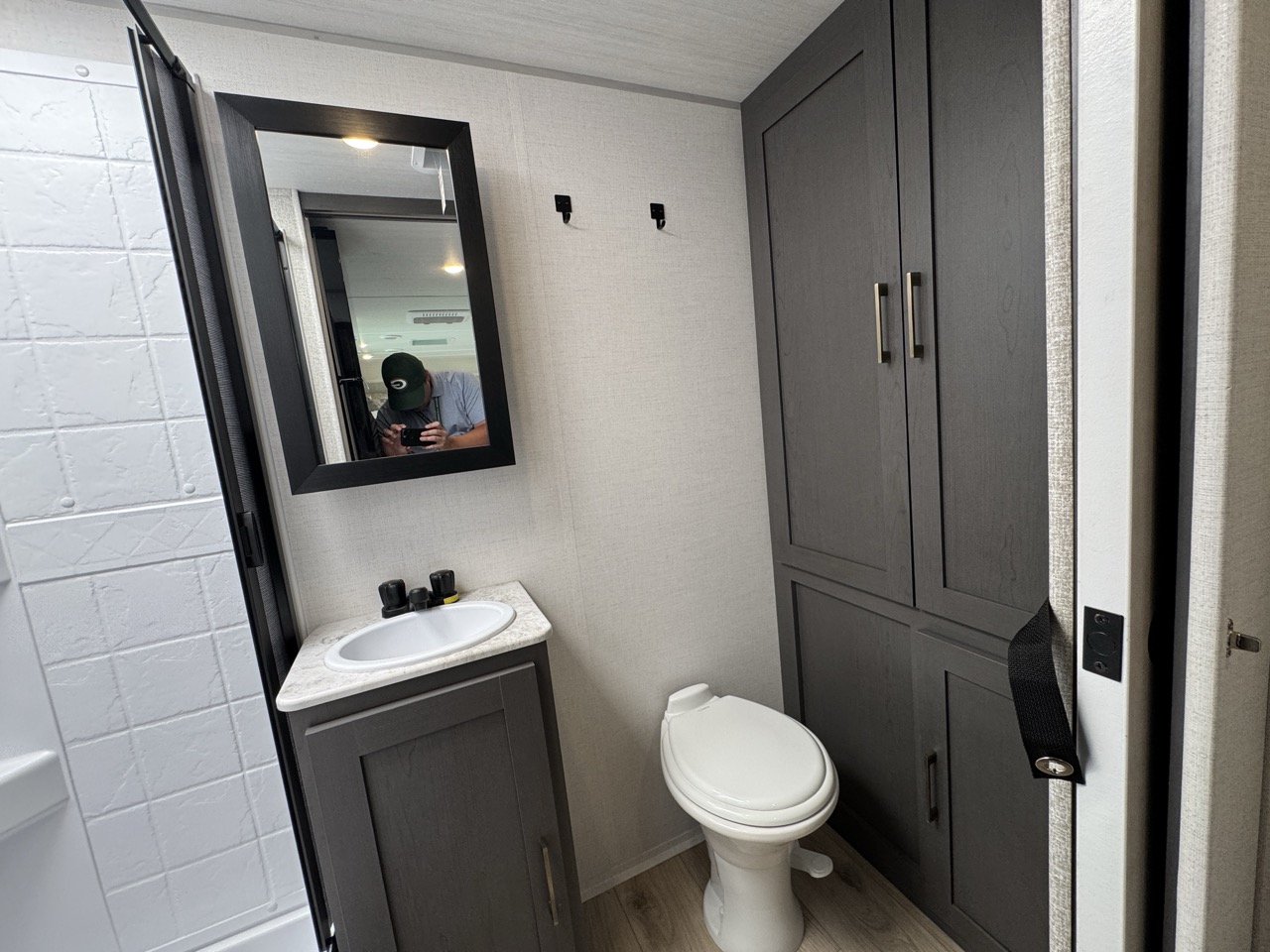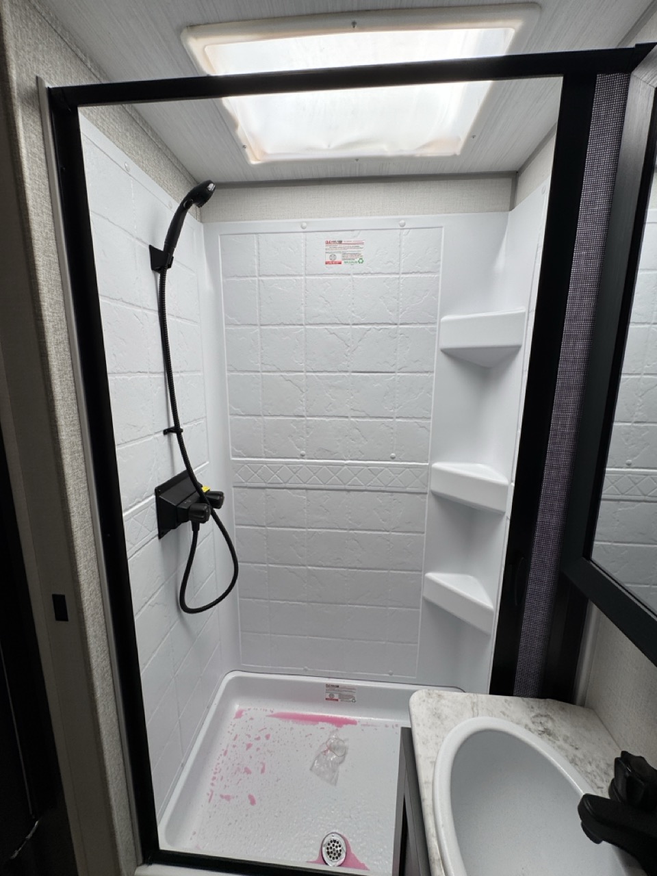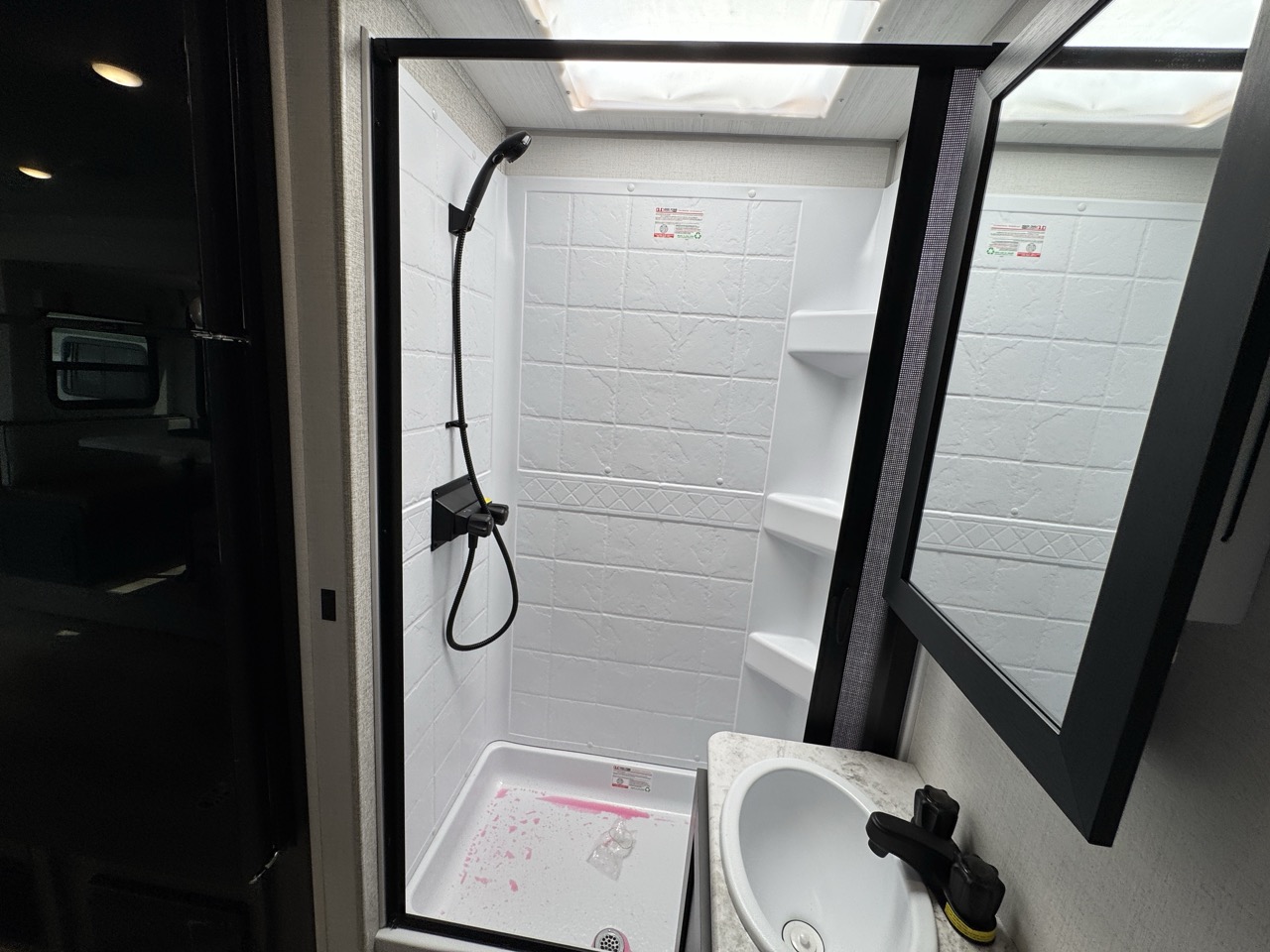 Full bathroom with upgraded shower enclosure and 4-speed high-powered bath fan