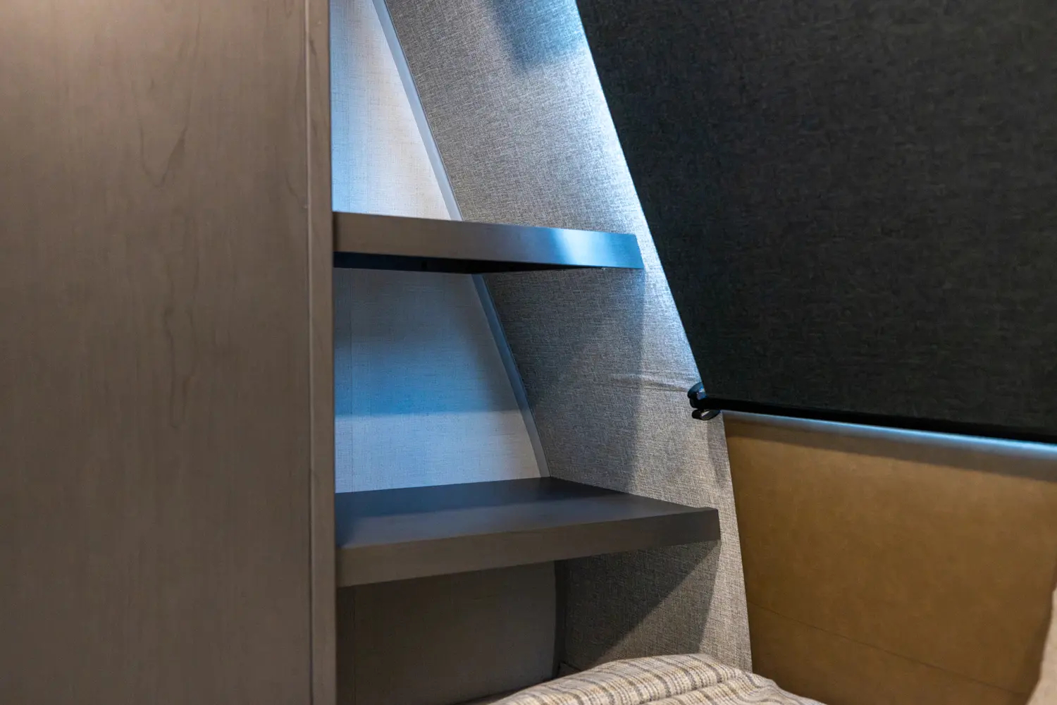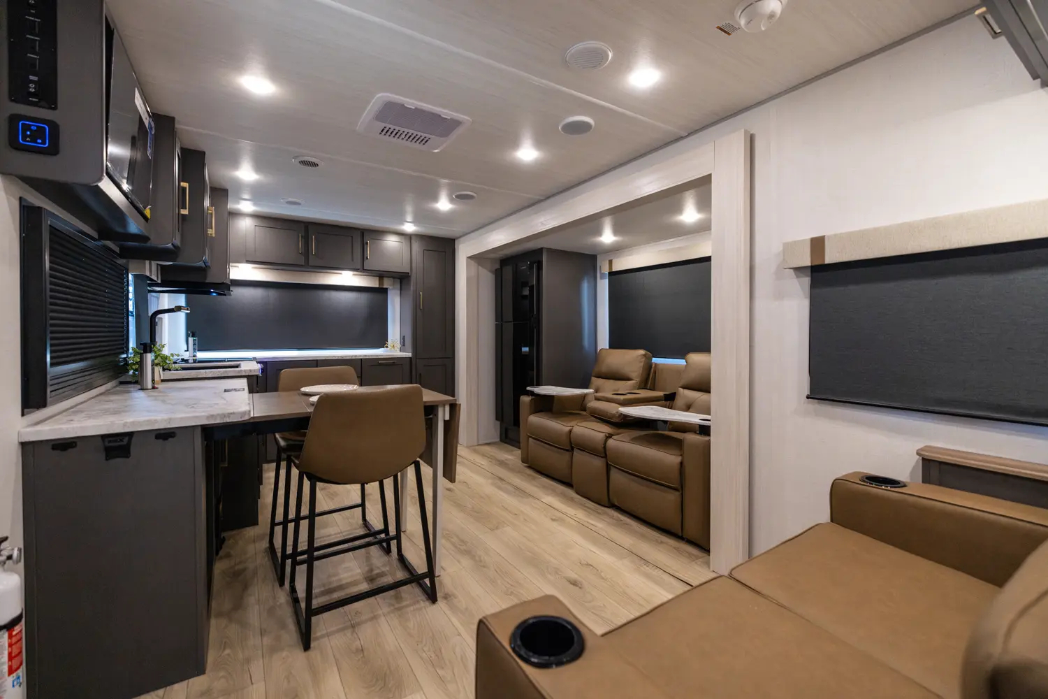 Open-concept living/kitchen area with premium window treatments and abundant storage