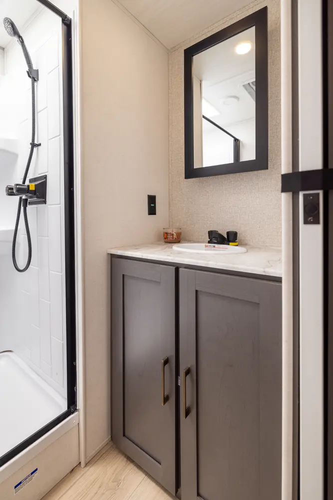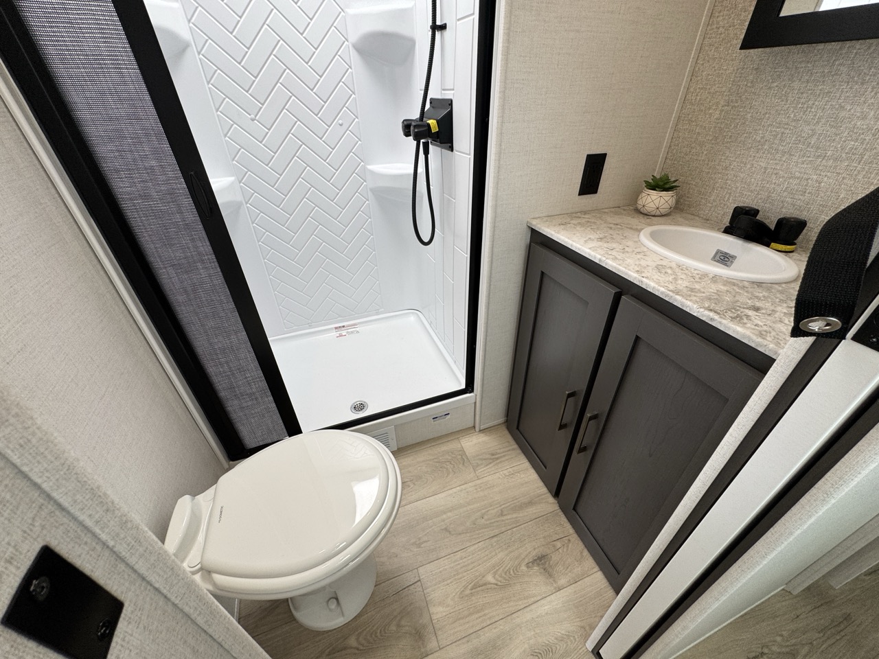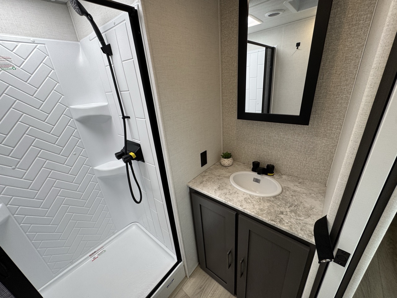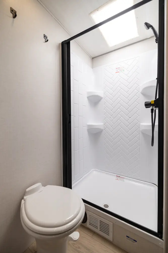 Spacious bathroom with upgraded shower enclosure and high-powered bath fan